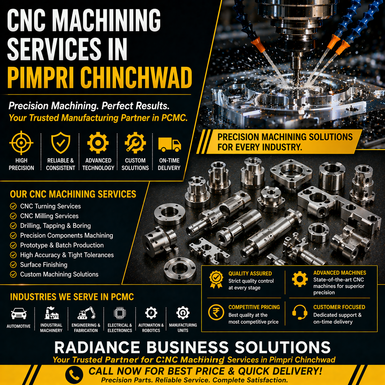 Pimpri Chinchwad (PCMC) is one of Maharashtraβs leading industrial hubs, home to automotive, manufacturing, and engineering industries. To maintain high production standards, businesses require accurate, reliable, and high-performance CNC machining services. If you are searching for CNC Machining Services in Pimpri Chinchwad, Radiance Business Solutions Pvt Ltd is your trusted partner for delivering precision-engineered components with fast turnaround.